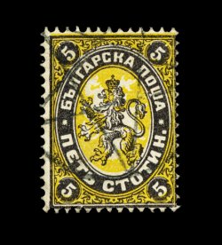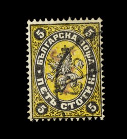437 O 7a image#7a, 1881 5s Black and orange, Background Inverted, a most attractive example of this very rare 19th century error, which only exists used, bright fresh colors, lightly cancelled, very fine; only a small number are known to exist; signed H. Bloch and others and accompanied by a 1957 Friedl certificate (Michel #7K; €3,000). (Image) 1,750.00