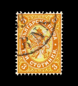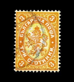 439 O 12a image#12a, 1882 3s Orange and yellow, Background Inverted, unusually well centered, brilliant colors, neat c.d.s. postmark, extremely fine; only nine examples (all used) have been recorded, this being one of the finest; signed Peter Holcombe (Michel #14K; €3,600). (Image) 1,400.00