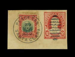 485 O 240a image#240a, 1910 2c Carmine and green, Center Inverted, a rare postally used example, tied to piece of 2c Entire by "Place Tas Santa Clara/29 Mar 1911" duplex pmk., stamp with gum toning around edges, very fine appearance; this is the first used example we have ever offered and it is quite undercataloged as such. (Image) 500.00