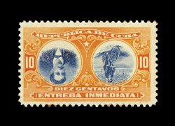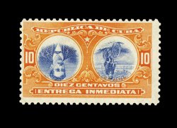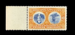 488 nh E4a image#E4a, 1910 10c Orange and blue special delivery, Center Inverted, a select quality left sheet-margin mint single of this very scarce error, being exceedingly well centered within very large margins, plus it is uncommonly fresh, with beautiful colors on crisp white paper, full clean o.g., stamp n.h. (hinged in the selvage only), extremely fine; an elusive stamp, being especially rare in this outstanding never hinged condition. (Image) for hinged 1,150.00