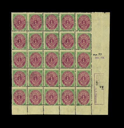 493 og/nhbl 5 var image#5a var., 1873 1c Green and rose lilac, first printing, Frame Inverted, a single inverted frame contained in a bottom right corner margin block of 25, the invert being position 77 in the sheet of 100, strong rich color from the distinctive first printing, o.g., at least fifteen stamps including the invert are never hinged, some hinge reinforcements, fine; a rare showpiece, the inverted frame from the first printing is especially scarce; 1998 APS certificate; ex-Hagemann with his handstamp in the margin (Facit 5a, 5av1). (Image) Est. 2,000-3,000