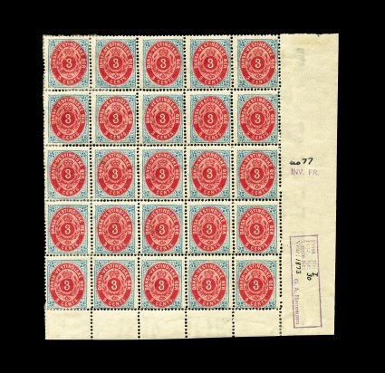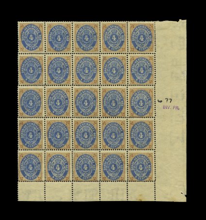 495 og/nhbl 7b, 7d image#7b, 7d, 1873 4c Brown and ultramarine, first printing, Frame Inverted, a single inverted frame contained in a bottom right corner margin block of 25, the invert being position 77 in the sheet of 100, rich colors, fresh o.g., all stamps except the top left and top right are never hinged, fine-very fine; an extraordinarily rare and desirable showpiece, as any block of the 4c first printing is very scarce, but to find one this large containing the inverted frame position is truly remarkable, in fact this is one of the largest known multiples of the 4c first printing; ex-Hagemann with his handstamp in the margin (Facit #7a, 7av). (Image) Est. 7,500-10,000