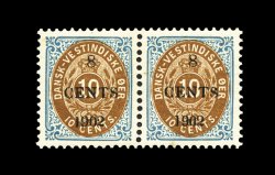 497 nh 25, 25c image#25, 25c, 1902 "8 CENTS 1902" Surcharge on 10c Blue and brown, Normal and Inverted Frames, pos. 51-52, horizontal se-tenant pair, the left stamp being the scarce inverted frame variety, outstanding centering, rich luxuriant color on bright white paper, o.g., never hinged, extremely fine; an especially handsome pair; 1981 Kaiser certificate (Facit #26, 26v2). (Image) Facit 4,000SK
