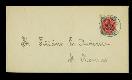 499 c 27 image#27, 1902 "2 Cents 1902" Surcharge on 3c Blue and lake, Frame Inverted, tied by St. Thomas 1902 c.d.s. on local cover, stamp with small bit of gum staining at top left, otherwise very fine (Facit #25; SK 7,500). (Image) 500.00