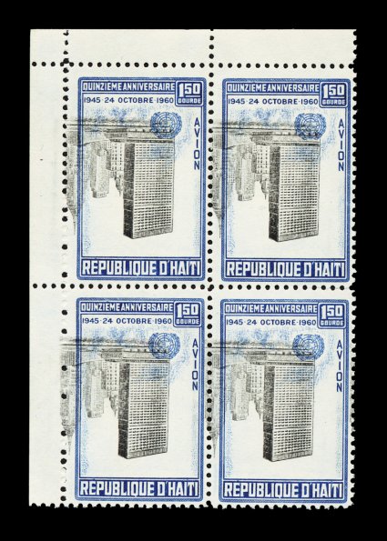 542 nhbl 469 var image#469 var., C168-69 var., 1960 United Nations Anniversary, Centers Inverted cplt. in top left corner margin blocks, centers also shifted as always, o.g., n.h., very fine. (Image) Est. 400-500