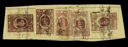 549 O K-M 151a imageKoeppel-Manners #151a, 1898 1a Brown violet revenue, Center Inverted, two examples tied to piece along with three normal stamps (the inverts are the fourth and fifth stamps) by ms. cancels, mostly large margins all around, distinct brown violet color, some minor gum staining as often on these, very fine appearance; very rare to find two inverted centers on one piece; 2000 APS certificate. (Image) Est. 300-400
