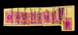 550 O K-M 151a imageKoeppel-Manners #151a, 1898 1a Magenta revenue, Center Inverted, two examples tied to long piece along with seven normal stamps (the inverts are the second and sixth stamps) by ms. cancels, ample to large margins, strong color in the magenta shade, light file fold affects one invert, some really trivial gum staining, very fine appearance; a very rare item; 2000 APS certificate. (Image) Est. 300-400
