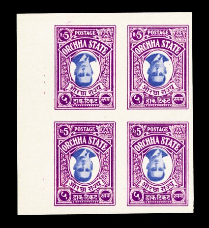 552 ogbl 27 var imageS.G. #27 var., 1935 5R Bright blue and plum imperforate, Center Inverted, without gum as issued, left sheet-margin block of four, other margins also large, brilliantly fresh, extremely fine. (Image) Est. 100-150