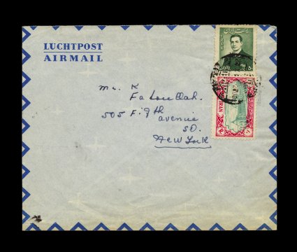 560 c 927a image#927a, 1950 10R Carmine and blue green, Center Inverted, bright fresh color, tied to air mail cover along with 50d Green (#954) by Tehran c.d.s., sent to New York, very fine; a great modern postal history rarity of Iran, as well as being one of the few post-WWII commercial cover rarities in the world, this being one of only two known covers bearing this inverted center. (Image) Est. 1,000-1,500