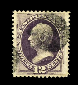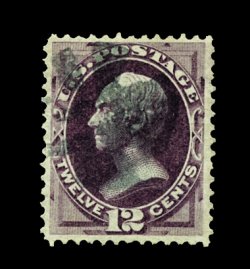 184 O 140 image#140, 12c Dull violet with grill, an incomparable used example of this truly rare and impossibly difficult stamp, possessing physical characteristics that are unchallenged by any other existing example, with absolutely enormous margins and being perfectly centered within them, gloriously rich color (not faded as often seen) and a strong impression on bright paper, easily identifiable grill points, wonderfully postmarked with a light strike of a fancy NYFM cancel, plus a bit of a red cancel as well, an extremely fine gem destined for placement in a collection that contains only the finest possible quality; 2001 PF and PSE certificates. (Image) 3,000.00