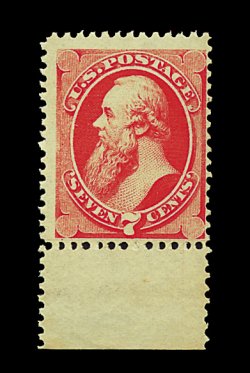 190 nh 149 image#149, 7c Vermilion, bottom sheet-margin mint single, strong color and impression, o.g., never hinged, fine; one of the few certified never hinged examples available; photocopy of a 1998 PF certificate for a block of six, this being the bottom right stamp. (Image) for hinged 850.00