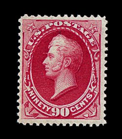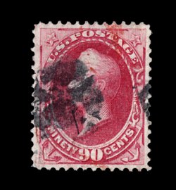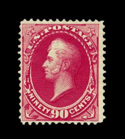 188 O 144 image#144, 90c Carmine with grill, an unusually choice used example of a stamp that is almost impossible to find in any kind of acceptable quality, quite well centered within large margins, but more impressive is this stamp's overall freshness, with prooflike color and impression on fresh clean paper, plus it has been only very lightly cancelled, unlike the majority of known copies that have heavy unappealing postmarks, very fine and handsome; 1985 PF certificate. (Image) 1,600.00