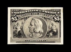 260 P 230P3-45P3 image#230P3-45P3, 1c-$5.00 Columbians, plate proofs on India cplt., each with large margins all around except $4.00 close in one place, strong colors, a few values with faint translucent stains from previous hinging, still a very fine set of these popular proofs. (Image) 2,075.00
