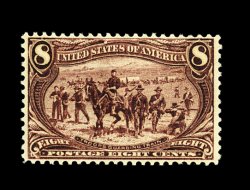 342 nh 289 image#289, 8c Trans-Mississippi, a sensational bottom sheet-margin imprint single that is, unquestionably, one of the rarest stamps in the entire sale in terms of its condition, as this stamp features physical qualities that are next to impossible to find on this notoriously difficult value from the series, including mathematically precise centering amid enormous jumbo margins for the 8c value, eye-arresting dark violet brown color and a razor-sharp impression, pristine o.g., n.h., superb; easily among the very finest 8c Trans-Mississippis we have ever seen, let alone had the pleasure of offering in our auctions; 1999 PF certificate for a pair, this being the left stamp. (Image) 360.00