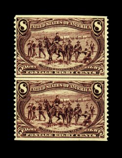 345 og 289a image#289a, 8c Trans-Mississippi, vertical pair, imperforate horizontally, with horizontal guide line between, rich luxuriant color, centered slightly to the left as are nearly all examples, o.g., lightly hinged, faint horizontal bend between the stamps, otherwise very fine; only one sheet of fifty stamps (twenty-five pairs) was ever found, making this one of the very few opportunities for a collector to acquire an example this important classic error rarity; 2002 PSE certificate. (Image) 22,500.00
