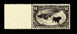 351 nh 292 image#292, $1.00 Trans-Mississippi, a choice "post office" fresh mint left sheet-margin single of this popular and beautiful commemorative, featuring intense "jet" black color and an unusually crisp impression, excellent centering as well, clean o.g., never hinged, extremely fine; a particularly desirable never hinged example; 2002 PF certificate for a strip of three, this being the bottom stamp. (Image) 2,600.00