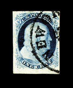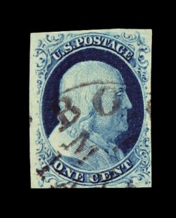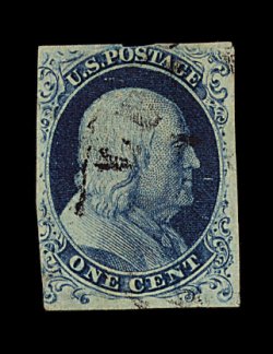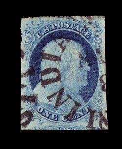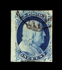 21 O 6 image#6, 1c Blue, Ty. Ia, used, margins ranging from just in at top to quite large at right and at bottom, which is the key margin to show the important Type Ia design characteristics, incredibly deep color and excellent detailed impression, very light town c.d.s., small closed tear at bottom, a fine appearing and affordable example of this classic rarity. (Image) 10,000.00