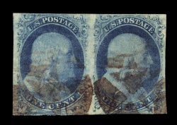 25 O 8 image#8, 1c Blue, Ty. III, position 99R2, a fabulous appearing example of this rare and highly soughtafter classic stamp, possessing margins of extraordinary size all around, including a partial sheet margin at bottom, strikingly intense color in an especially deep shade, and its impression is quite well defined showing enormously wide breaks both at top and bottom, neat portion of New Orleans c.d.s., few small and faint thin spots, plus a mild horizontal crease, none of which affect this stamp's stunning extremely fine appearance; a highly representative example of the most distinctive position to display true Type III design characteristics; 1990 PF certificate. (Image) 4,750.00
