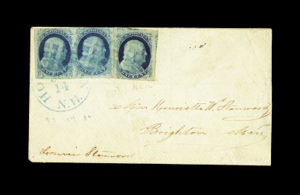 24 c 7, 9 image#7, 9, 1c Blue, Ty. II, Ty. IV, horizontal pair Ty. II (93-94R2) with mostly large margins all around and fresh color, single Ty. IV (16L1L) with huge margins, deep color and an intense impression, all tied by blue Hopkinton c.d.s. and grids on cover to Brighton, Ma., cover with trivial closed tear at right, choice very fine; an attractive and most unusual 1851 1c Blue combination usage; signed Ashbrook and accompanied by a 2002 PF certificate. (Image) Est. 500-750
