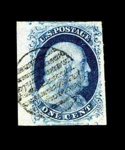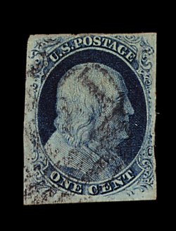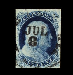 28 O 8A image#8A, 1c Blue, Ty. IIIa, used, margins ranging from large to just touching design at left, strong early color and impression, bold c.d.s. (cancel so strong it slightly penetrates the paper in one place), tiny tear at bottom, very fine appearance; 1999 PSE certificate. (Image) 1,000.00