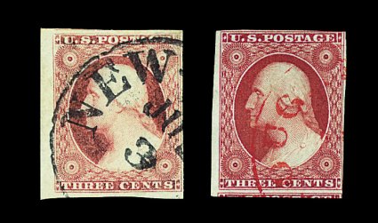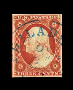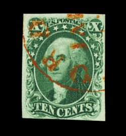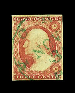 32 O 11 image#11, 3c Dull red, four large margins, cancelled by a bright and unmistakable green c.d.s of York, Pa., extremely fine; genuine green cancels on the 1851 3c are quite scarce; 1995 PF certificate. (Image) 160.00