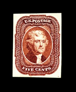 34 ng 12 image#12, 5c Red brown, a magnificent quality unused example of one of the rarest and most challenging stamps of the 19th century to find in true gem condition, with this incredible stamp possessing numerous spectacular physical qualities that clearly create one of the finest in existence, including margins that are not only extravagantly large, but impressively balanced as well, its color is sumptuously rich and its impression would rival any proof on immaculately fresh and bright paper, without any of the faults that affect most known unused/mint examples, accompanying certificate describes the state of the gum as "traces of o.g.", however we believe a more accurate description is small part o.g., extremely fine; a superb unused classic for the finest collection; 2002 PF certificate. (Image) 9,750.00