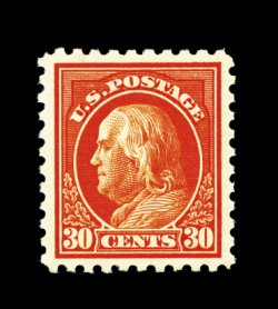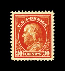 504 nh 420 image#420, 30c Orange red, a spectacular mint single that is perfectly centered within enormously large margins that are almost unheard of on this value, strong vivid color and impression on fresh white paper, o.g., n.h., extremely fine; a large-margined gem for the perfectionist; 1999 PF certificate. (Image) 225.00