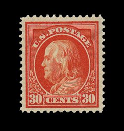 505 nh 420 image#420, 30c Orange red, an exceptional mint example, featuring extraordinarily large and well balanced margins all around, strikingly intense color and a razor-sharp impression on bright fresh paper, unblemished o.g., n.h., an extremely fine gem which possesses great eye appeal; 1985 and 1997 PF certificates; ex-Lyons. (Image) 225.00