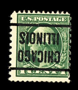 509 O 424a image#424a, 1c Green, perforated 12 x 10, a used example of this very rare compound perforation variety, of which less than 20 are thought to exist, bold inverted "Chicago/Illinois" precancel, deep luxuriant color, centered just into perfs. at right, vertical crease and a thin spot, about fine appearance; 1977 APS certificate. (Image) 4,000.00