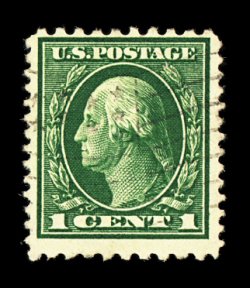 510 O 424b image#424b, 1c Green, perforated 10 x 12, handsome used example of this vary rare and seldom offered variety, quite well centered in comparison to most known copies, bright vibrant color, very light machine flag cancel instead of the more typically seen Dayton, Ohio precancel, light diagonal crease at top right, otherwise very fine for this; less than 50 examples of this variety were ever found, all of which are used. (Image) 4,000.00