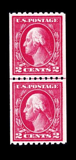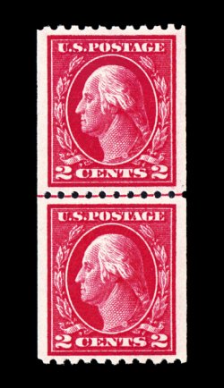 520 og 442 image#442, 2c Carmine flat plate coil, perf. 10 horiz., gem guide line pair, incredibly well centered within uncharacteristically large margins, in a decidedly more intense and deep shade than typically seen, o.g., l.h., extremely fine; 1989 PSE certificate. (Image) 60.00