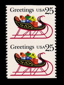 704 nh 2428a image2428a, 25c Sleigh, imperforate horizontally, vertical pair, o.g., n.h., very fine; a rare error that seldom comes up for auction. (Image) 2,000.00