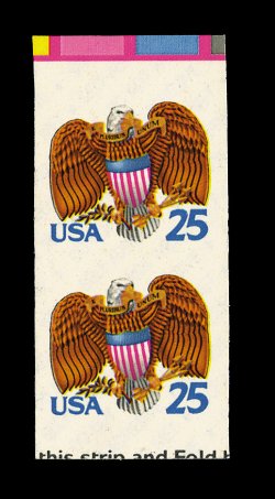 705 nh 2431b image#2431b, 25c Eagle and shield, vertical pair, no die cutting between, top margin pair from the booklet pane, with full backing, extremely fine; a very scarce booklet pane error; photocopy of a 1990 PF certificate for the booklet pane from which this came. (Image) 850.00