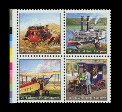 706 nhbl 2437b image#2437b, 25c UPU Congress se-tenant block of four, dark blue omitted, left margin block, better centering than normally encountered on this error, o.g., n.h., very fine; 1992 PF certificate. (Image) for fine 700.00