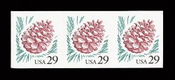 714 nh 2491b image#2491b, 29c Pine Cone, horizontal pair, no die cutting between, strip of three, the two right stamps being the error pair, with full backing, very fine; a seldom seen error that is listed but unpriced in both Scott and Datz. (Image) Est. 500-750
