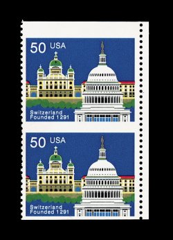 718 nh 2532a image#2532a, 50c Switzerland, imperforate horizontally, top right corner margin vertical pair, o.g., n.h., very fine; an extremely rare error. (Image) 2,250.00