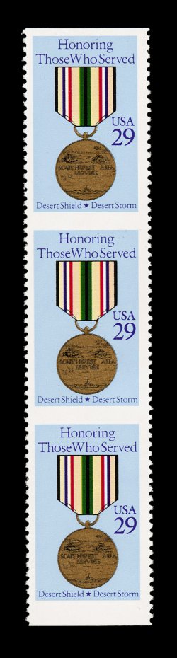 720 nh 2551a image#2551a, 29c Desert Storm, imperforate horizontally, bottom margin vertical strip of three, o.g., n.h., very fine; less than 30 pairs exist; cataloged as a pair. (Image) 1,500.00+