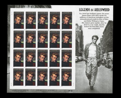 741 nhbl 3082a image#3082a, 32c James Dean, imperforate, complete pane of twenty, o.g., n.h., few insignificant bends and fingerprints from handling, very fine; cataloged as ten pairs. (Image) 3,500.00+