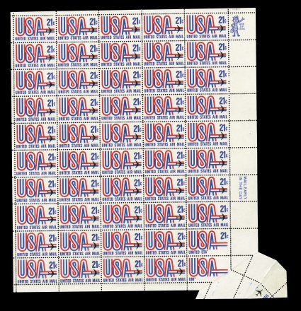 743 nhbl C81a image#C81a, 21c "USA" and Jet, black (engraved) color omitted, a most remarkable complete sheet of fifty, where a significant foldover in the bottom right corner caused the position 45 stamp to be the black color omitted error, while the position 50 stamp, which displays an enormous and freakish foldover, has the black color printed on the gummed side and is omitted from the front, the remaining stamps in the sheet are normal, o.g., n.h., very fine; this unique sheet produced the sole known examples of each major error; an important modern error rarity and a marvelous showpiece for the air post specialist as well; listed but unpriced in Scott, however the Datz catalog does price the intact sheet at $12,100.00, which is the price this sheet realized in a November 1997 auction ($11,000.00, plus the buyer's premium); 2001 PF certificate (Image) Datz 12,100.00