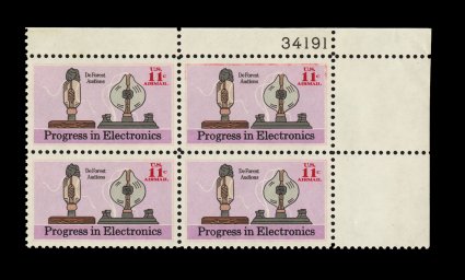 744 nhX C86c image#C86c, 11c Progress in Electronics, olive color omitted, top right corner plate no. 34191 block of four, this discovery plate block contains the only four examples known of the olive color omitted error, the stamps also only have partial or faint traces of the vermilion color, well centered, o.g., n.h., extremely fine; an enormously rare color missing error that is listed in both Scott and Datz, however neither catalog has yet attempted to value it; 1998 PF certificate. (Image) Est. 5,000-7,500