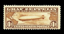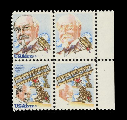 745 nhbl C94b image#C94b, 21c Octave Chanute air post se-tenant pair, engraved ultramarine and black omitted, right sheet-margin transition block of four, the right vertical pair being the error, while the left pair has the colors partially omitted, o.g., n.h., very fine; one of the rarest modern errors and certainly one of the keys to a specialized United States air post collection; Datz notes "5 pairs reported...transition multiples exist and sell for a premium"; 1991 PSE certificate; ex-Weisman. (Image) 4,500.00