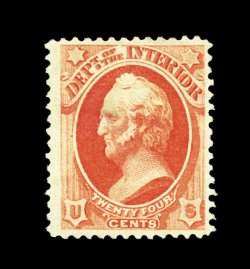 841 og O103 image#O103, 24c Interior, on soft porous paper, nicely centered, bright color, o.g., h.r., small repaired surface scrape, a very fine appearing example of this scarce key official; 2001 PF certificate. (Image) 3,250.00