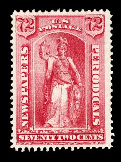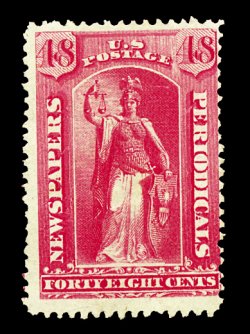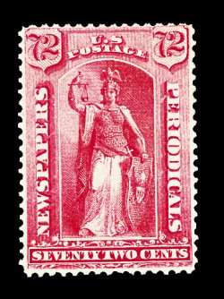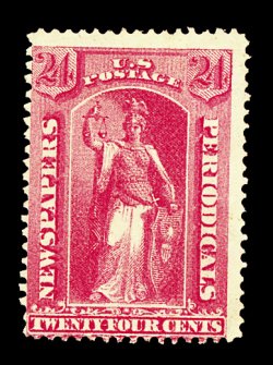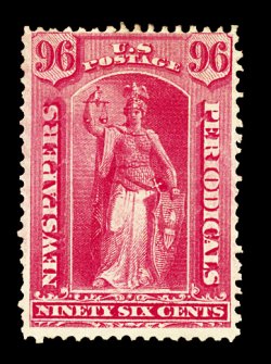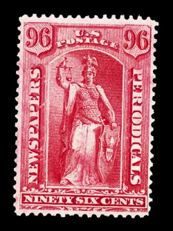 846 og PR23 image#PR23, 96c Rose, unusually fresh, rich luxuriant color, well centered, full clean o.g., lightly hinged, very fine; a seldom offered newspaper stamp in any condition; 2000 PF certificate. (Image) 500.00
