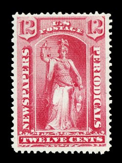 850 og PR40 image#PR40, 12c Rose special printing, without gum as issued, an incredibly choice example of this very scarce stamp, being in far superior quality to the vast majority of known copies, wonderfully well centered amid uncharacteristically large margins, strong fresh color and impression on bright paper, even its perforations are unusually intact for a special printing, extremely fine; only 1,313 issued. (Image) 1,000.00