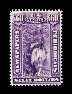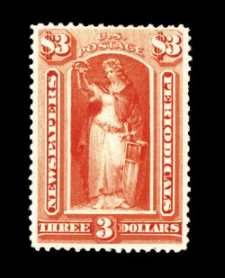 856 og PR49 image#PR49, $3.00 Vermilion special printing, without gum as issued, magnificently fresh and bright, rich vivid color distinctive only to the special printing, strong detailed impression on immaculate paper, marvelously well centered and margined, completely intact perforations all around, extremely fine. This stunning stamp is, without question, the finest extant of the scant twenty copies issued. With so few in existence, this stamp is not only an immense newspaper rarity, but ranks as one of the most important rarities in all of United States philately. One of the most exciting stamps we have ever had the pleasure to offer in our auctions, this being the second time we have presented this stamp to our clientele. Its first appearance was in our May 1998 sale of the collection formed by Eliot H. Weisman. It realized a then record price of $19,800.00 against a catalog value of $10,000.00. Now cataloging $21,500.00, and with a much more vibrant current marketplace among collectors seeking newspaper rarities, we fully expect that this stamp will once again realize a record price far exceeding its current catalog value. Signed Ward and accompanied by 1960 and 1992 PF certificates, as well as a 1992 PSE certificate; ex-Engel, "Connoisseur" Collection and Weisman. (Image) 21,500.00