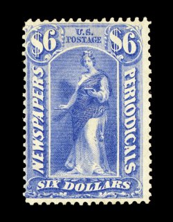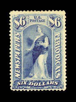 857 og PR50 image#PR50, $6.00 Ultramarine special printing, without gum as issued, exceptionally fresh, with bright vibrant color distinctive only to the special printing, crisp detailed impression as well, fully intact perforations all around, nearly very fine for this. Only fourteen examples of the 1875 Six Dollar Newspaper Special Printing were issued. This being only the second example we have seen in over 30+ years conducting philatelic auctions. An exciting opportunity to acquire not only one of the key newspaper rarities, but one of the most important stamps in United States philately. With only fourteen examples issued (and we assume that it is doubtful all fourteen still exist), this stamp's rarity is one par with several of the high profile Bank Note Special Printing rarities - i.e. Scott #180 (21 known), #181 (9 known), #203 (20 known), #204 (18 known), #205C (22 known) and #211D (26 known) - all of which catalog considerably more. Accompanied by a 1995 PSE certificate. (Image) 27,500.00