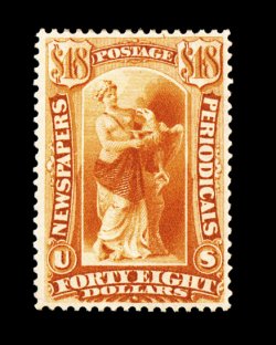 866 og PR100 image#PR100, $3.00 Scarlet, brilliantly fresh, sumptuously rich and vibrant color, well centered, full o.g., minor h.r., very fine for this. A magnificent example of this incredibly rare stamp. This being the only Scott #PR100 we have ever offered in our auctions, although this is the second time we have had the pleasure to sell this very stamp. Its first appearance was in our May 1998 sale of the Eliot H. Weisman collection. Because it was the first appearance of a Scott #PR100 in many years, it attracted extraordinarily spirited bidding, realizing $23,100.00 against a then catalog value of $7,500.00. After searching literally for hours trying to find this stamp's equal in any past auction catalog, we have come to the conclusion that not only is this stamp immensely rare in terms of the number known, but we are certain that this is the only sound, original gum Three Dollar Bureau issue newspaper extant. To more accurately gauge the current value of this remarkable stamp, we refer prospective bidders to our May 2002 sale of the Joseph E. Lessin collection. While he did not have an example of this stamp, his collection did contain a sound, original gum example of the Sixty Cent Bureau issue newspaper - an equally rare stamp - with a lesser catalog value of $13,500.00, versus $18,000.00 for a #PR100. Mr. Lessin's #PR98 realized a record price of $60,500.00, a clear indication of the popularity and appreciation of stamps from this immensely rare series. Accompanied by 1967 and 1992 PF certificates, as well as a 1992 PSE certificate; ex-Engel, "Connoisseur" Collection and Weisman. (Image) 18,000.00