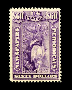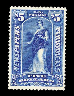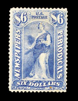 867 og PR101 image#PR101, $6.00 Pale blue, warm rich color distinctive only to the Bureau issues, full original gum, few small thin spots, trivial repaired corner perforation tip, tiny natural inclusion visible only on reverse, very fine appearance. A handsome and desirable example of the rarest regularly issued Newspaper stamp. Only 14 examples have been certified by the Philatelic Foundation and this is one of the few still retaining its full original gum. Virtually all have faults to some degree. One of the rarest stamps in all of United States philately, which is seldom offered in any condition. In looking over many of the great United States collections of the past, this stamp is either found faulty or totally lacking altogether. Accompanied by a 1996 PF certificate. (Image) 50,000.00