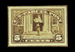871 E Q5-E1 image#Q5-E1, 5c City Letter Carrier model essay of the rejected design, being a black photograph of a wash drawing of the rejected design which was ultimately used for the 2c value, with vignette slightly retouched and "CITY LETTER CARRIER" lettering drawn in black ink, mounted on thick gray cardboard measuring 100x84mm, approved and signed by the Postmaster General on Oct. 10, 1912 and marked in pencil at top "Changed to 2c City Carrier", very fine and unique; ex-Doolittle. (Image) 2,500.00