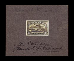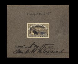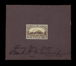 875 E Q12-E1 image#Q12-E1, $1.00 Manufacturing model essay of the rejected design, being a black photograph of a wash drawing of the first design ultimately used for the 25c value, extensive retouching in black ink throughout the central vignette and lettering, mounted on thick gray cardboard measuring 114x86mm, approved and signed by the Postmaster General on Oct. 22, 1912, also noted in pencil at top "Changed to 25c", tear to card at right not at all affecting essay itself, very fine and unique; ex-Doolittle. (Image) 2,500.00